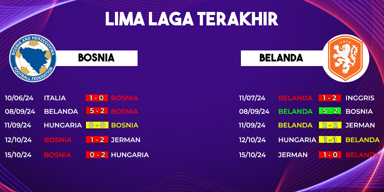 Pada pertandingan sebelumnya, kedua tim menunjukkan hasil yang kontras. Bosnia menderita kekalahan telak 0-7 saat bertandang ke Jerman. Sebaliknya, Belanda meraih kemenangan gemilang 4-0 saat menjamu Hungaria. Kemenangan tersebut memperkuat posisi Belanda sebagai salah satu tim kuat di grup ini.