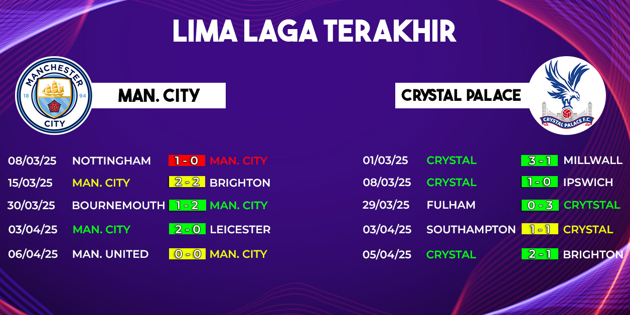 Di sisi lain, Crystal Palace datang ke Etihad dengan kepercayaan diri tinggi. Mereka hanya menelan dua kekalahan dari 17 pertandingan terakhir di semua ajang, termasuk kemenangan 2-1 atas Brighton pada pekan sebelumnya.