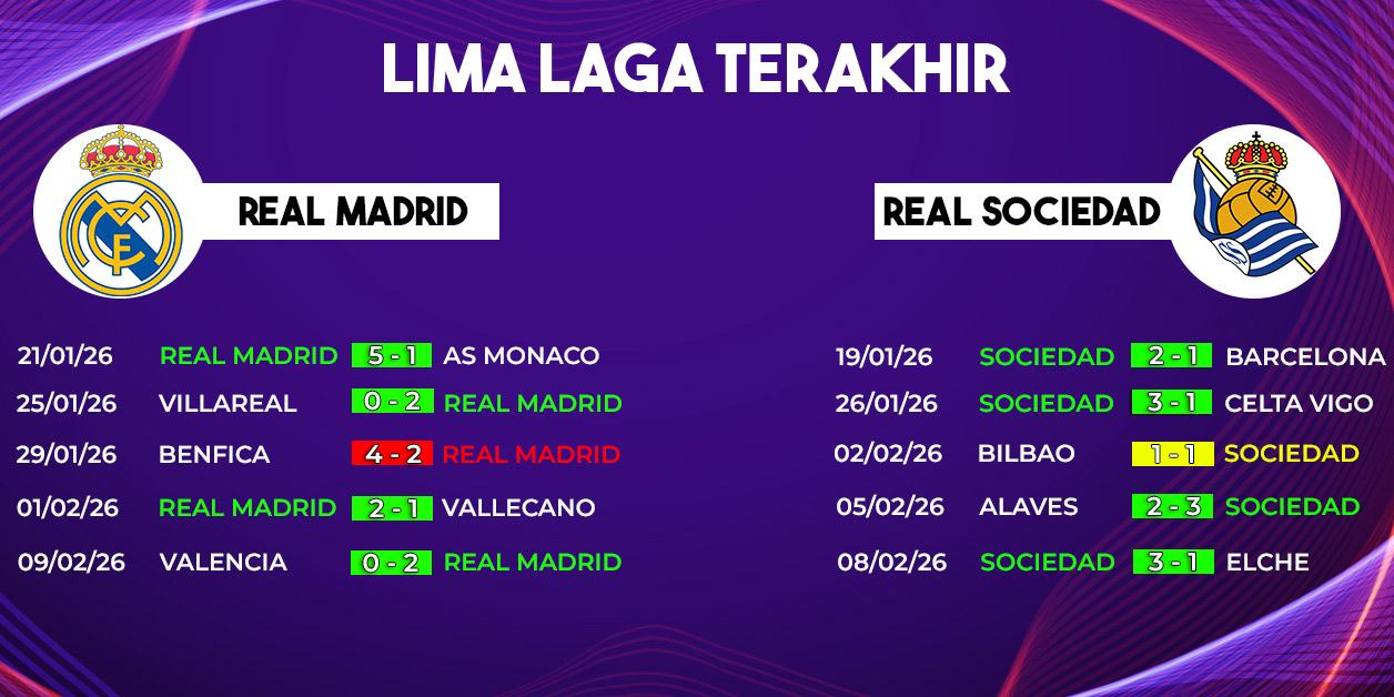Persaingan menuju gelar juara La Liga musim 2025/2026 semakin memanas. Pada laga Real Madrid vs Real Sociedad, Santiago Bernabeu akan menjadi saksi bisu duel sengit antara sang raksasa ibu kota, Real Madrid, menghadapi tim kuda hitam yang selalu menyulitkan, Real Sociedad, pada Minggu, 15 Februari 2026.